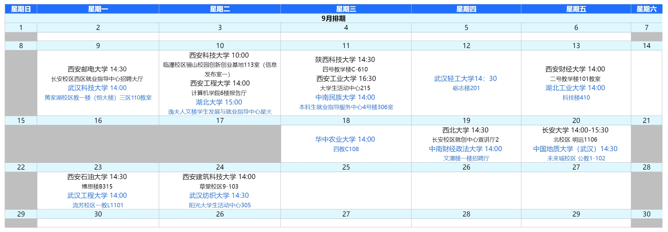 以下是招聘官网呈现的 2024-09 宣讲行程,即哪天要到哪个院校做线下宣讲。可以看出,除了华中农业大学是 211 以外,其他高校都不是 211。